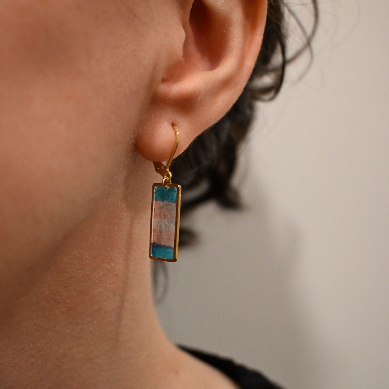 The Juno earring has a hand-drawn design incorporated in resin, in a rectangular gold colored frame, attached to a leverback earring.
